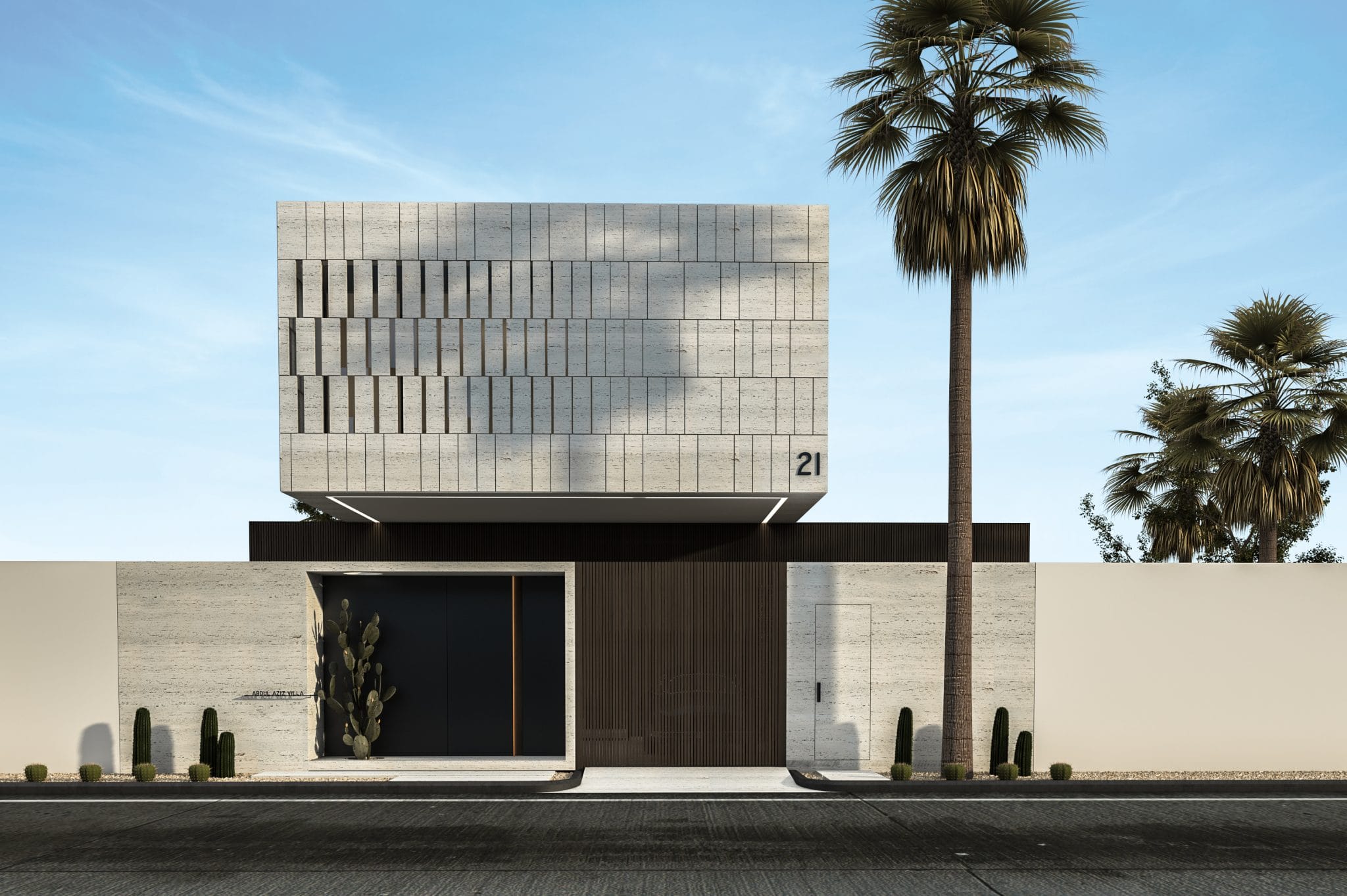 The design of NAS house is heavily influenced by the interplay of light and shadows, taking inspiration from traditional Arabic mashrabiya screens. The focus is on creating a rhythmic pattern on the front facade, achieved through the use of perforated white travertine both inside and outside the building.