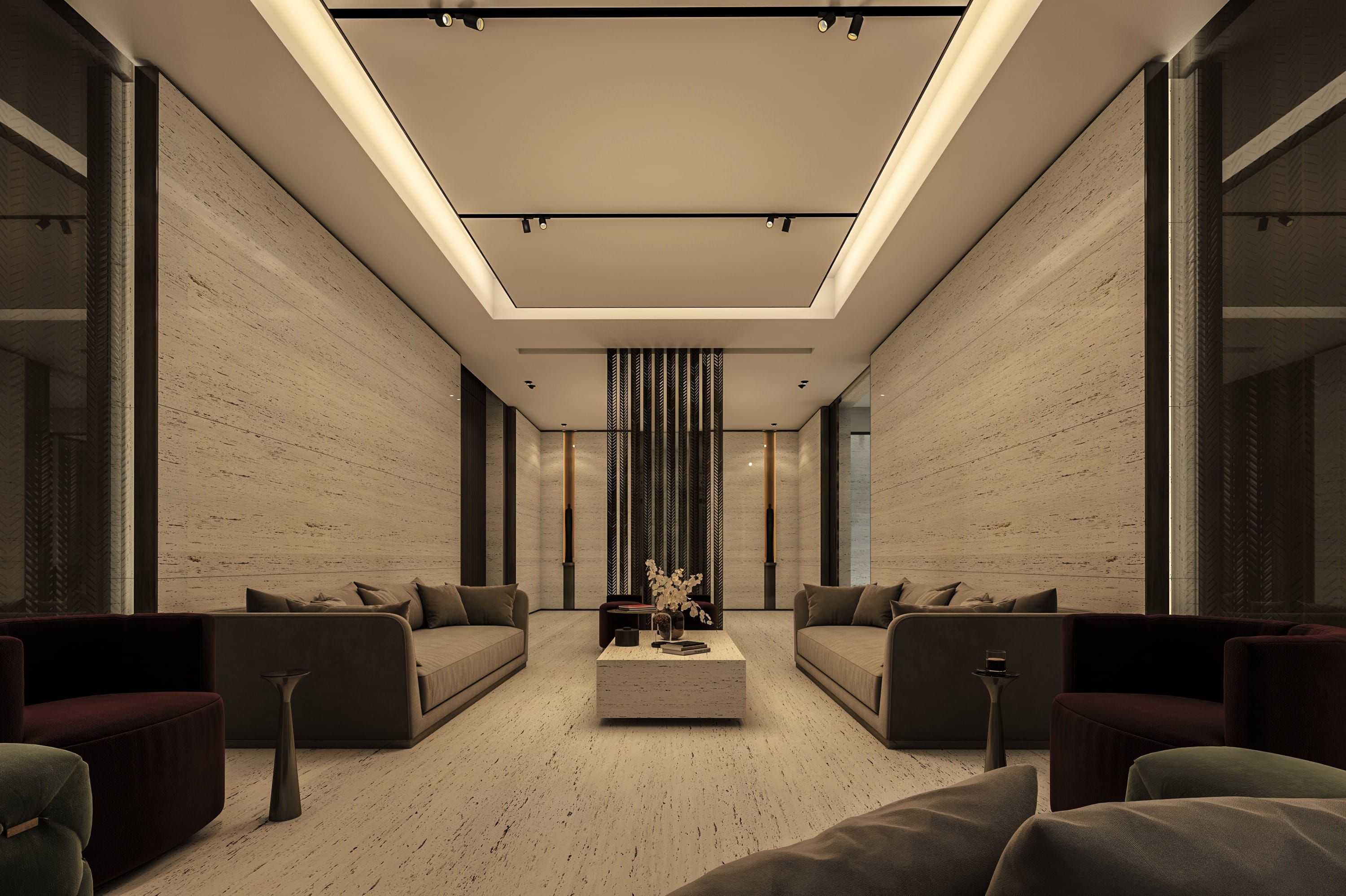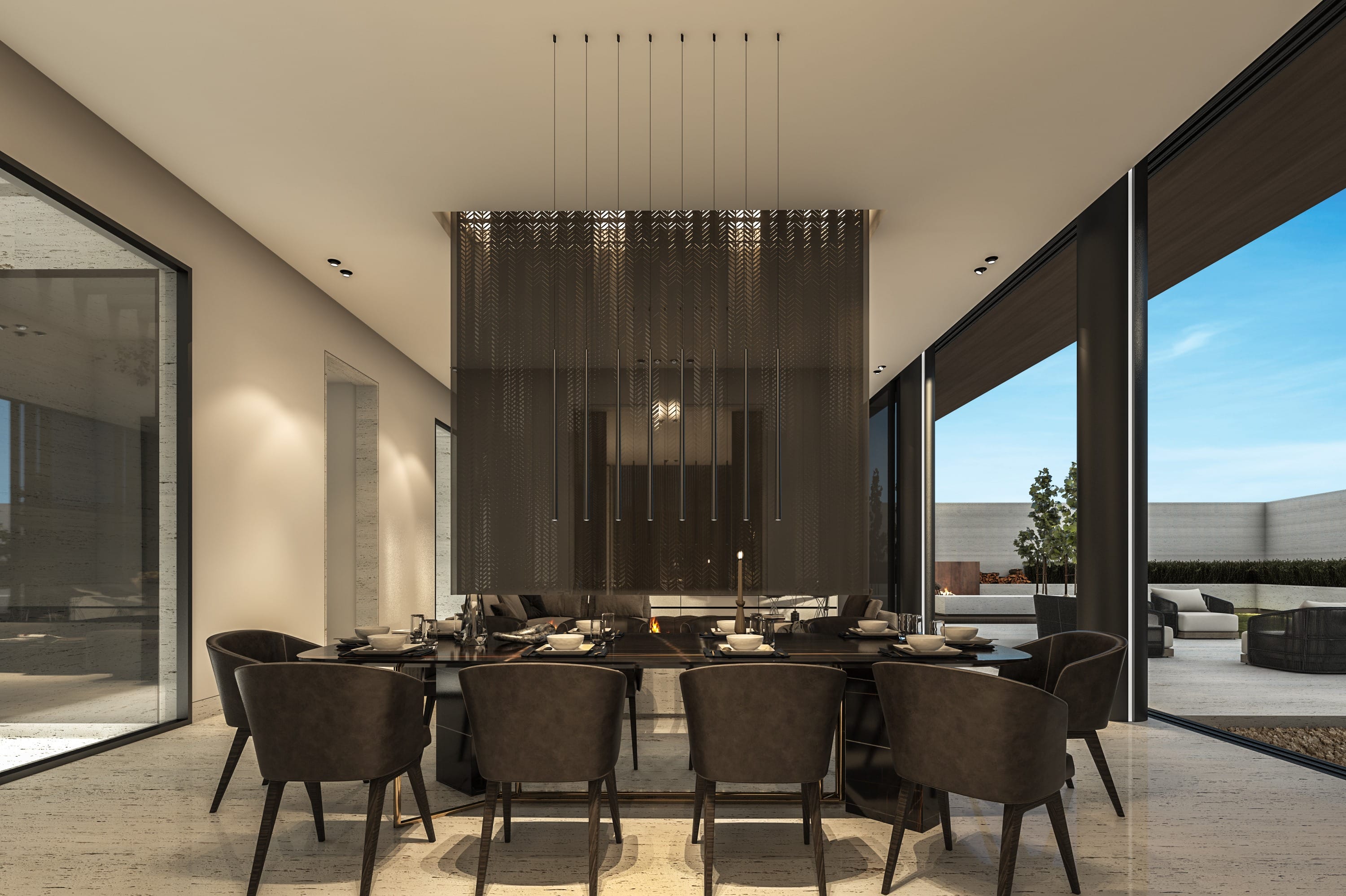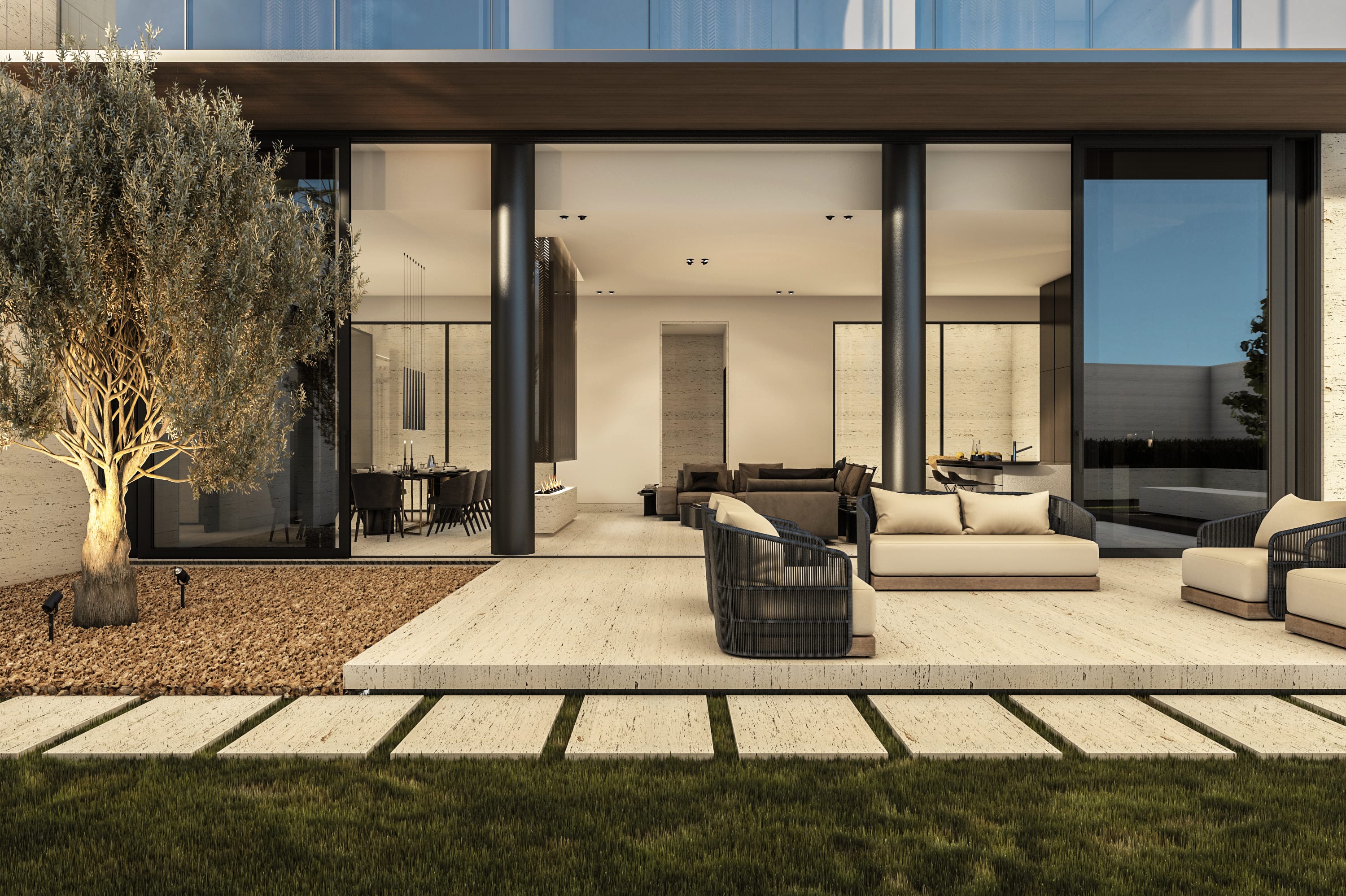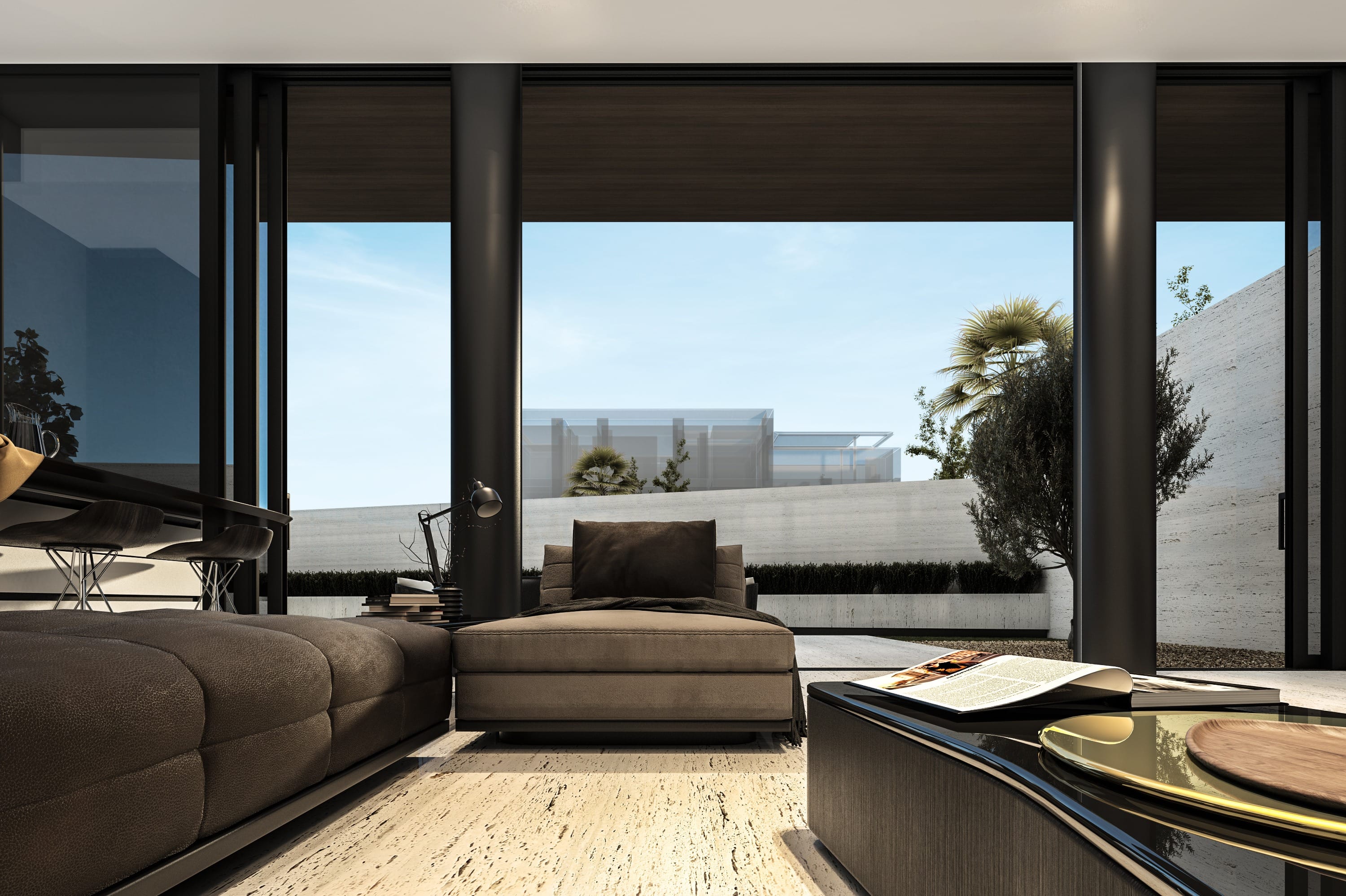 Interiors feature a modern material palette, combining luxurious white travertine, warm wood, and sleek glass elements. These materials are thoughtfully blended together to create a cohesive and sophisticated aesthetic.