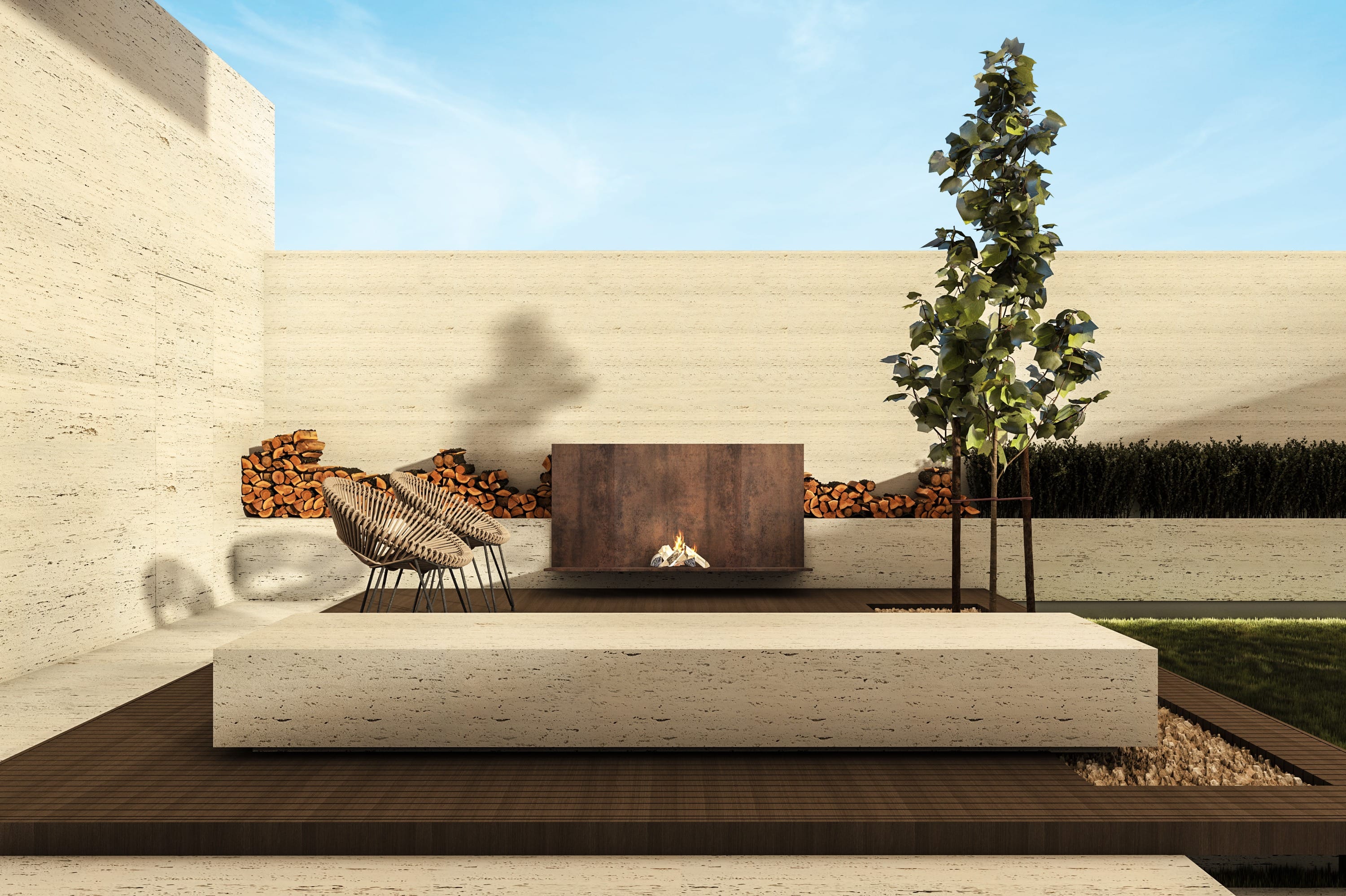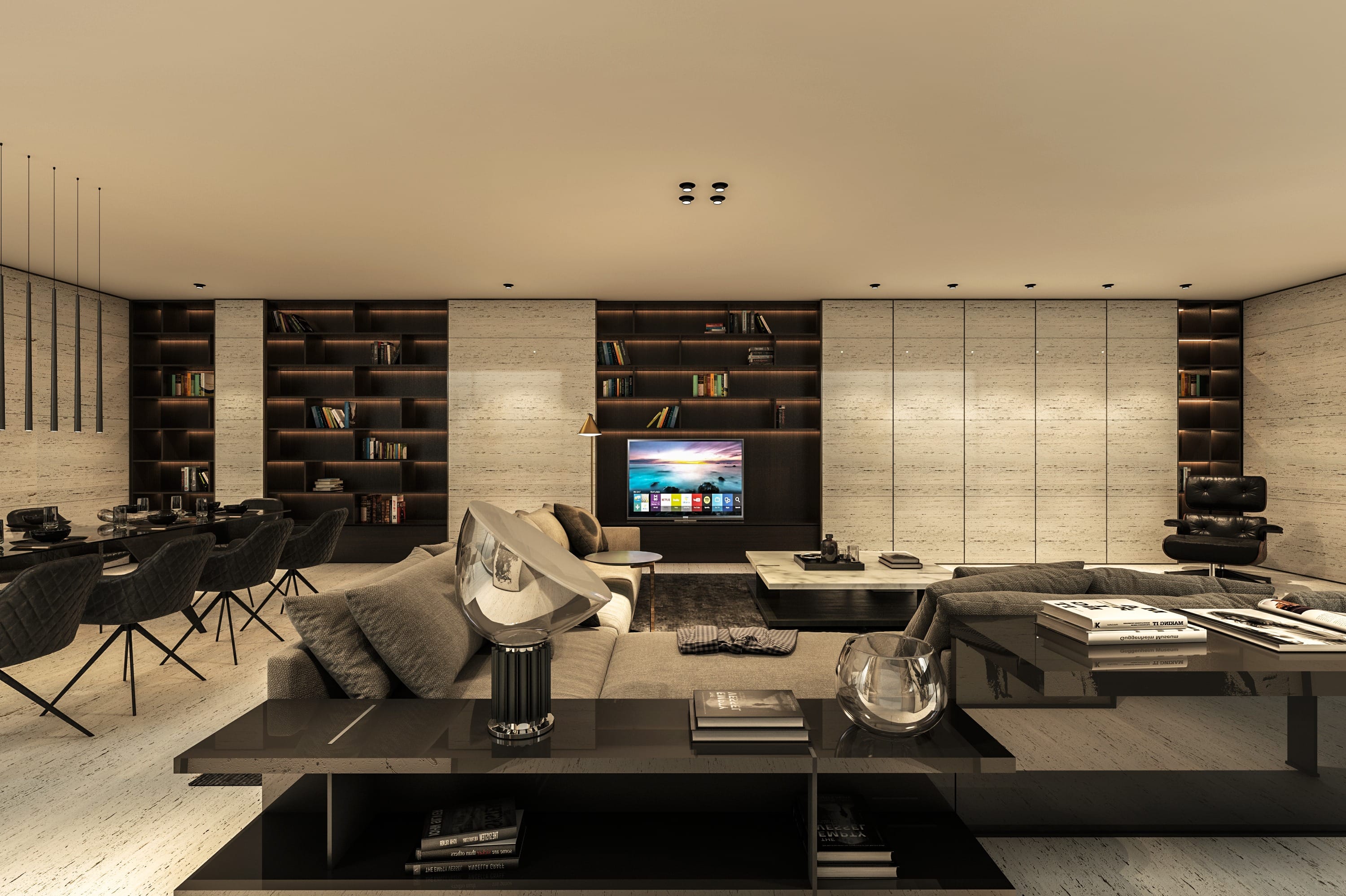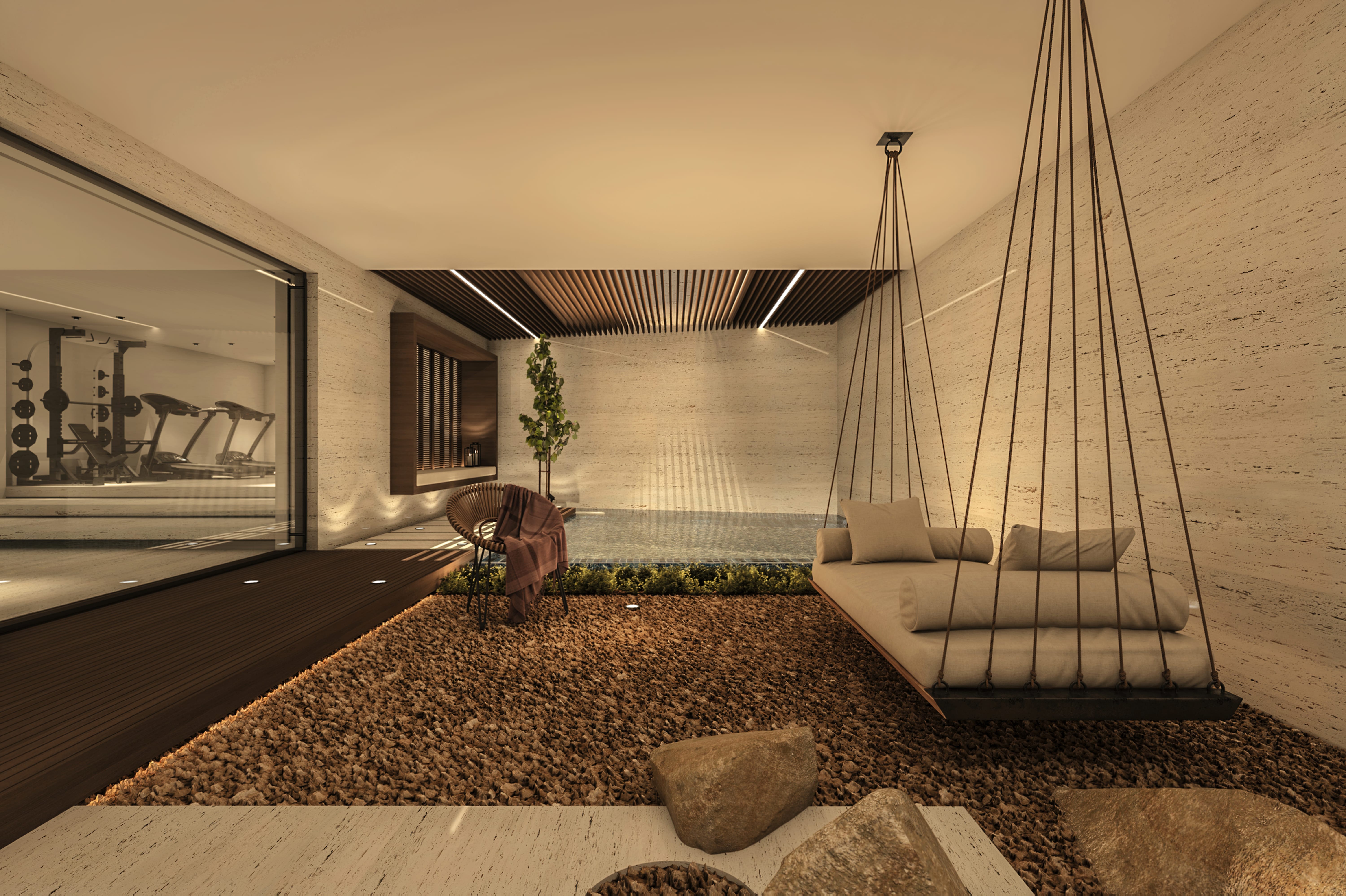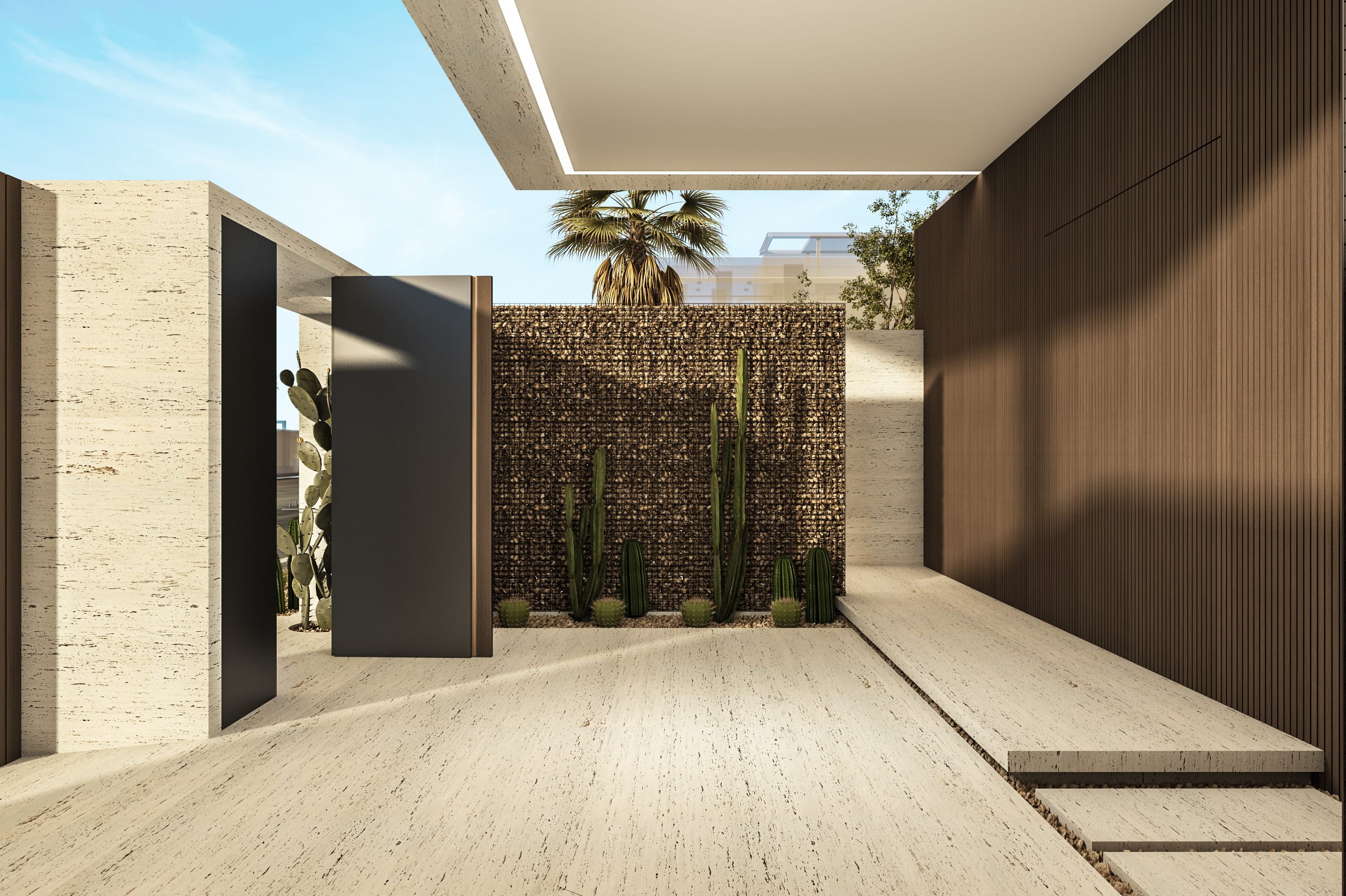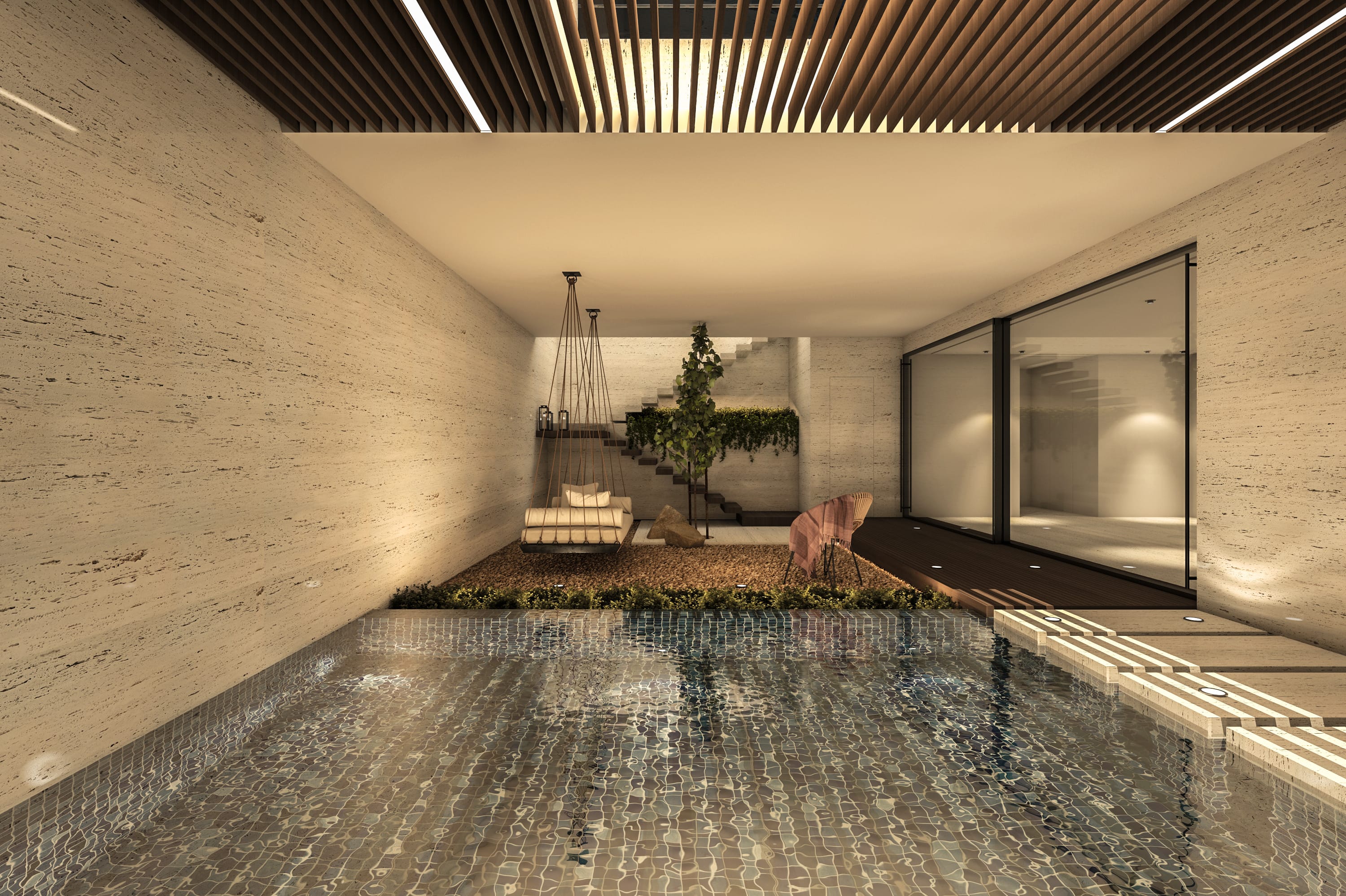 Interiors feature a modern material palette, combining luxurious white travertine, warm wood, and sleek glass elements. These materials are thoughtfully blended together to create a cohesive and sophisticated aesthetic.