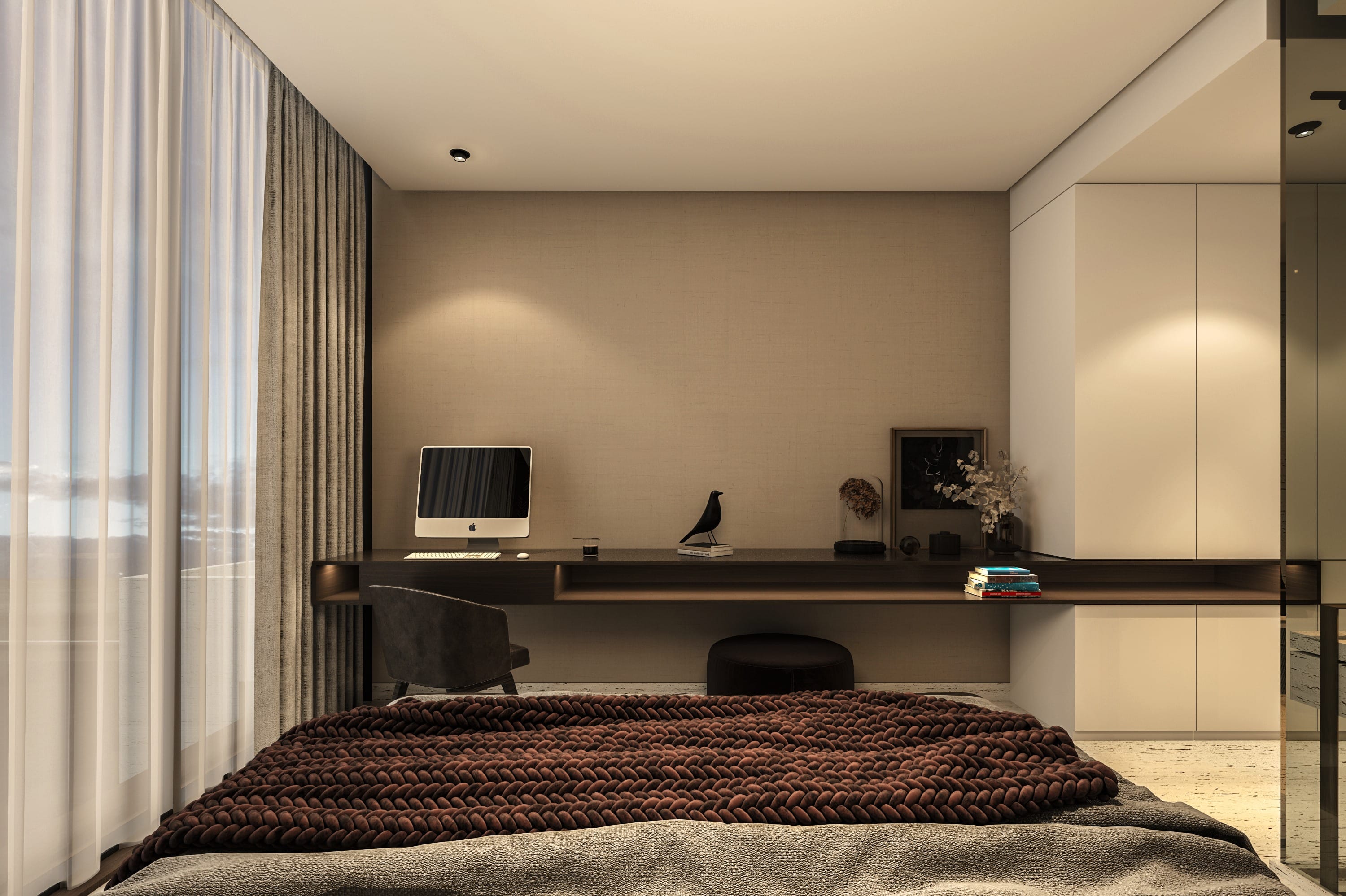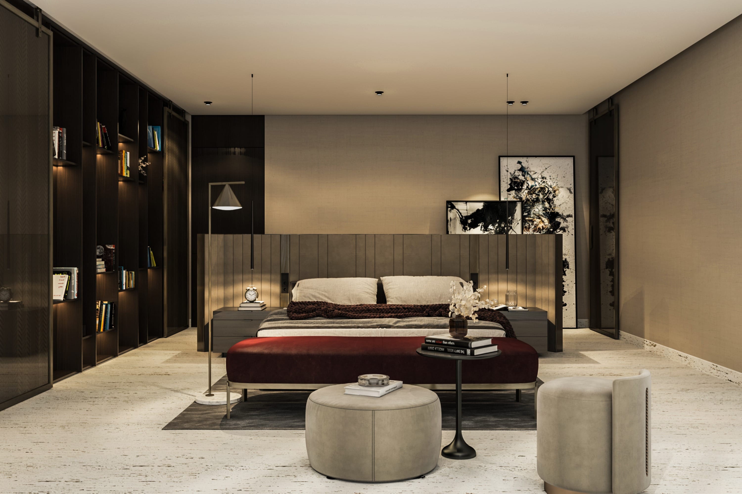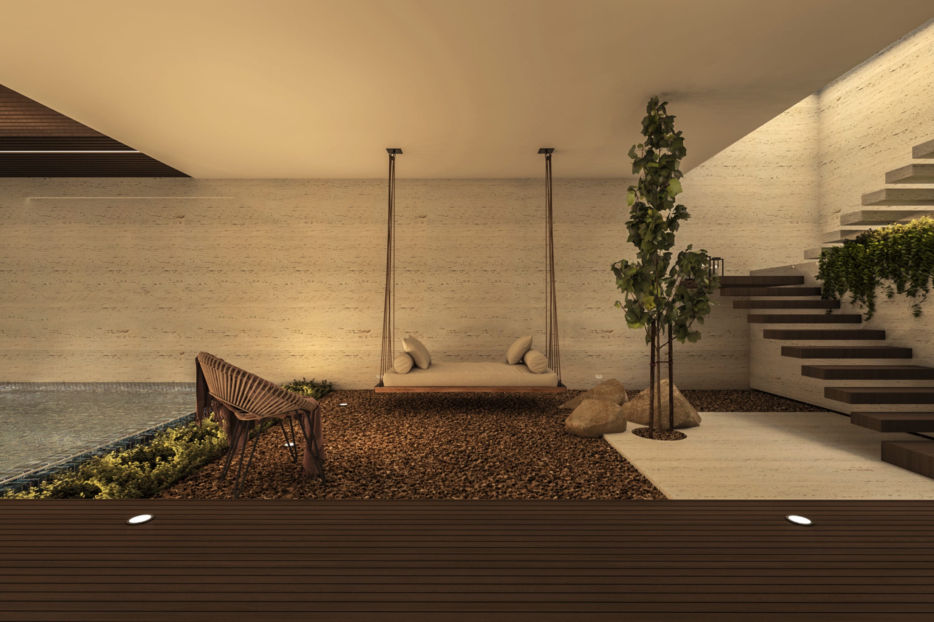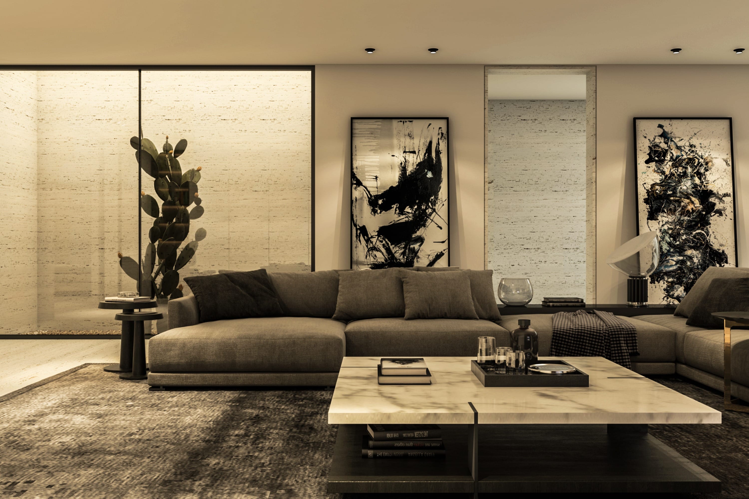 Interiors feature a modern material palette, combining luxurious white travertine, warm wood, and sleek glass elements. These materials are thoughtfully blended together to create a cohesive and sophisticated aesthetic.