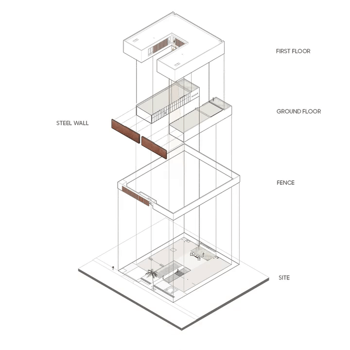 Inspired from modern architecture and boasts a sleek and minimalist design. The front facade incorporates two clean cantilevered masses that are kept white, emphasizing their striking lines and creating a bold visual effect. Between the masses lies a beautiful garden, adding a touch of natural beauty to the overall design and creating a peaceful and tranquil environment. The ground floor of the villa features curtain walls that allow ample natural light to flood the space, creating a bright and airy atmosphere. Clean lines and sharp angles give it the needed contemporary feel, while the use of industrial materials such as rusted steel & stone add warmth and texture to the overall aesthetic. We designed it to blend seamlessly with its natural surroundings, while also providing a luxurious and comfortable living space.