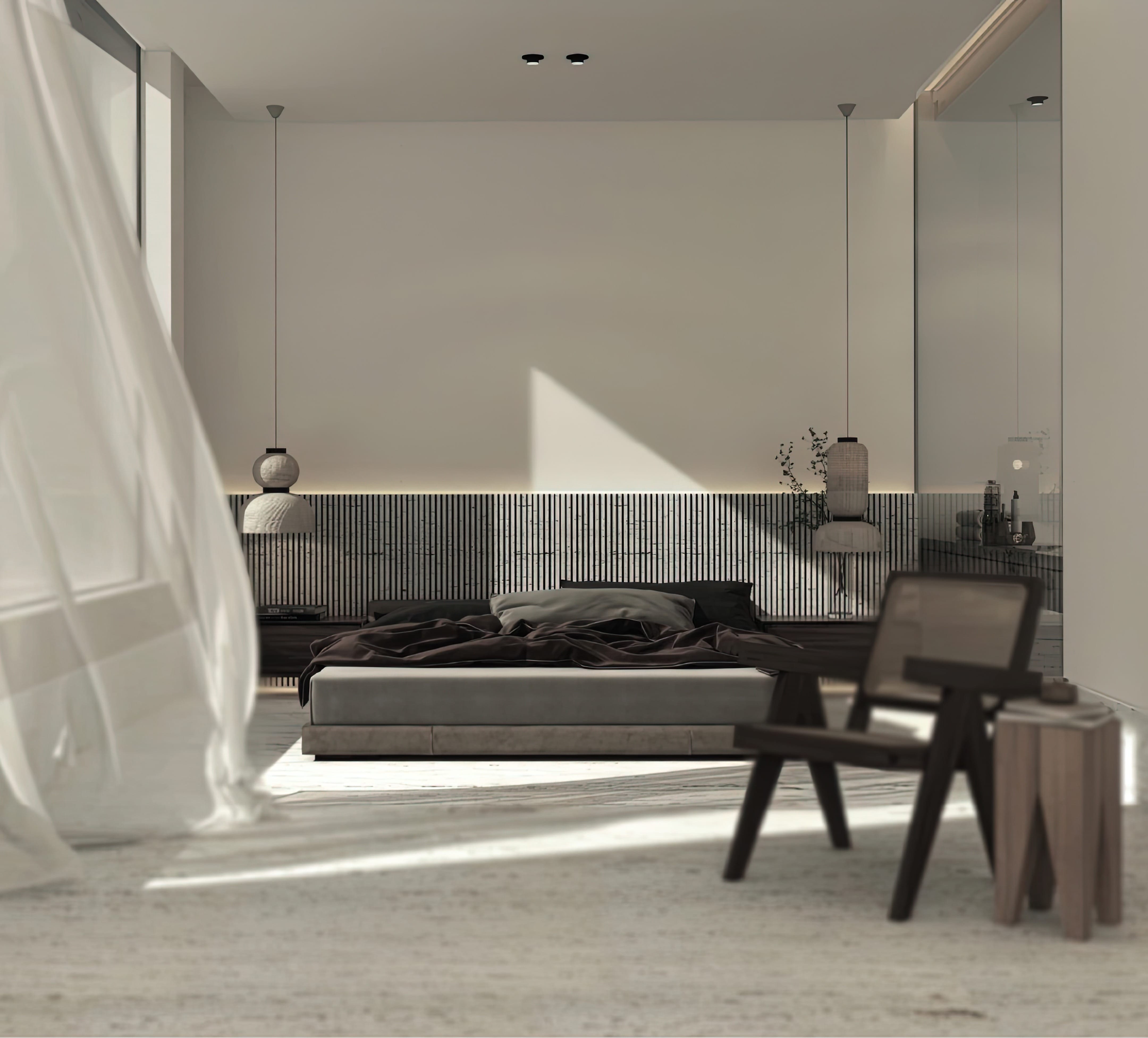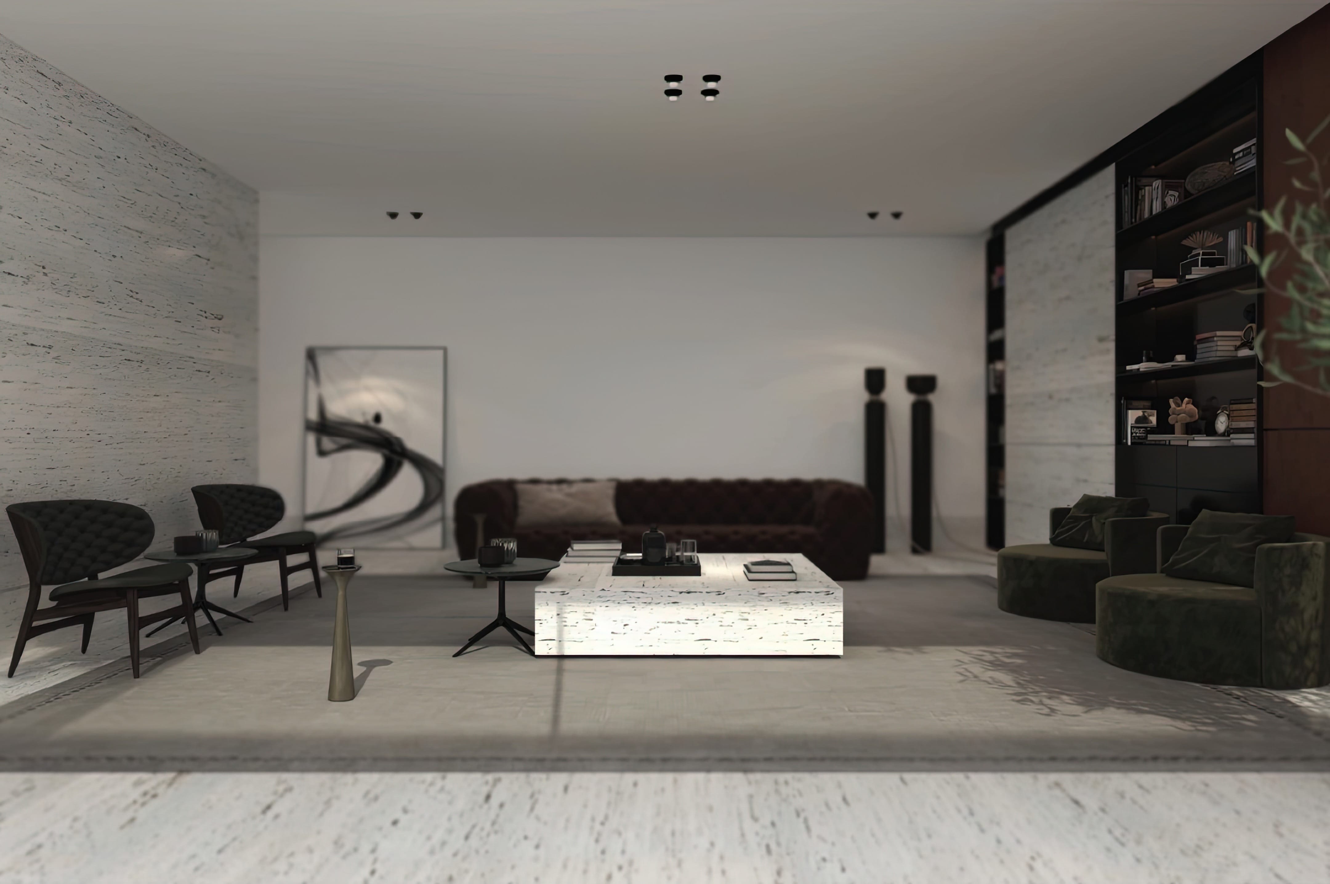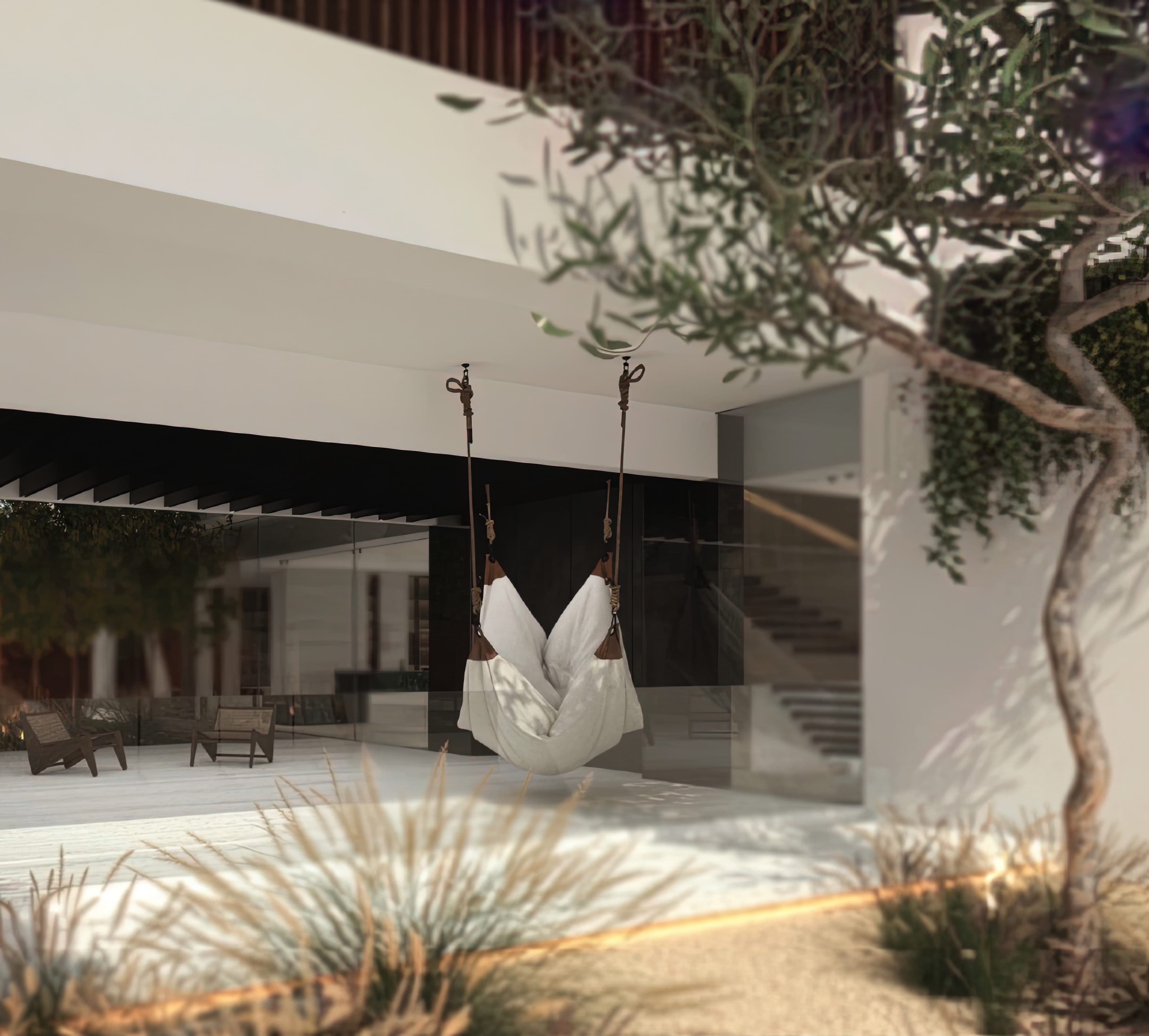 Inspired from modern architecture and boasts a sleek and minimalist design. The front facade incorporates two clean cantilevered masses that are kept white, emphasizing their striking lines and creating a bold visual effect. Between the masses lies a beautiful garden, adding a touch of natural beauty to the overall design and creating a peaceful and tranquil environment. The ground floor of the villa features curtain walls that allow ample natural light to flood the space, creating a bright and airy atmosphere. Clean lines and sharp angles give it the needed contemporary feel, while the use of industrial materials such as rusted steel & stone add warmth and texture to the overall aesthetic. We designed it to blend seamlessly with its natural surroundings, while also providing a luxurious and comfortable living space.